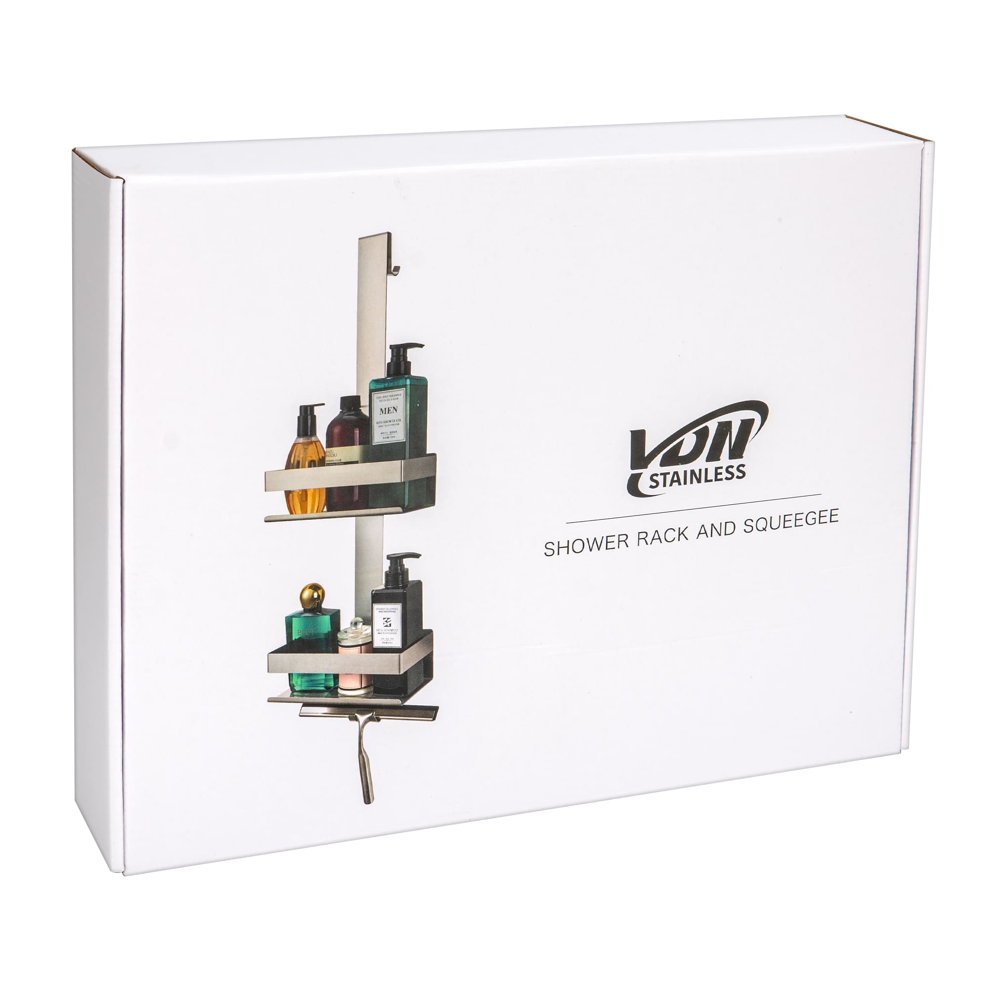 De stevige zuignappen aan de achterkant zorgen voor extra stabiliteit, zodat het rek stevig op zijn plek blijft. Dankzij het duurzame roestvrij staal is het doucherek perfect bestand tegen vocht en roest. Met twee ruime niveaus biedt het voldoende plek voor al je doucheproducten. En als extra krijg je er een stijlvolle RVS-look douchewisser bij – zo heb je meteen alles in huis.