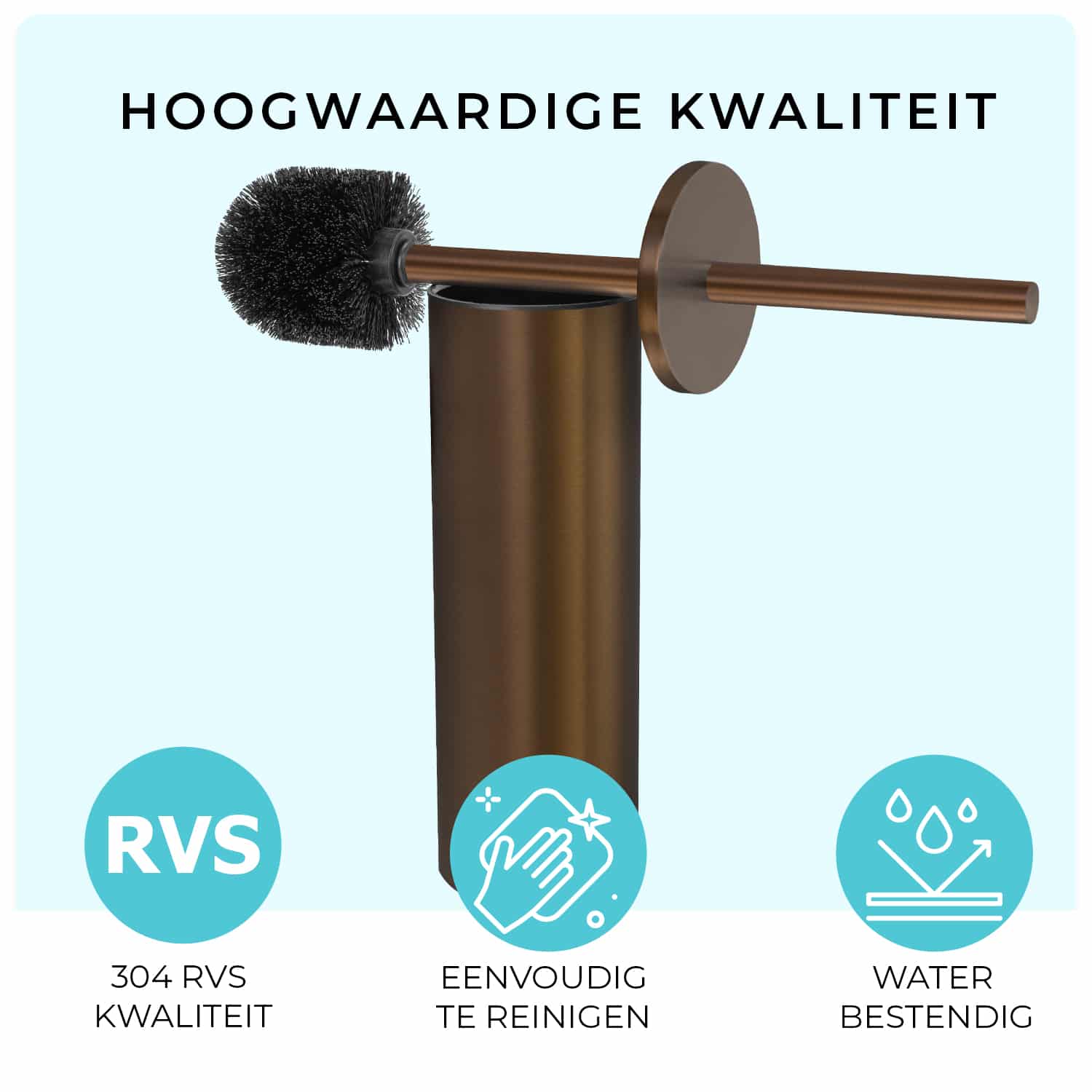 De VDN Stainless toiletborstel met houder in koperkleur is een stijlvolle en hygiënische oplossing voor elke moderne toiletruimte. Deze toiletborstelhouder combineert een luxe uitstraling met praktisch gebruiksgemak en draagt bij aan een nette en verzorgde badkamer of toilet. De houder is vervaardigd uit hoogwaardig roestvast staal (RVS) en is uitstekend geschikt voor gebruik in vochtige ruimtes. De toiletborstel is voorzien van een ronde afsluitdeksel die perfect aansluit op de houder, waardoor de borstel discreet wordt opgeborgen. Daarnaast beschikt de houder over een uitneembare binnenpot die vuil en vocht opvangt, wat zorgt voor een hygiënische en eenvoudige reiniging. De warme koperen afwerking geeft het geheel een moderne en luxe uitstraling.