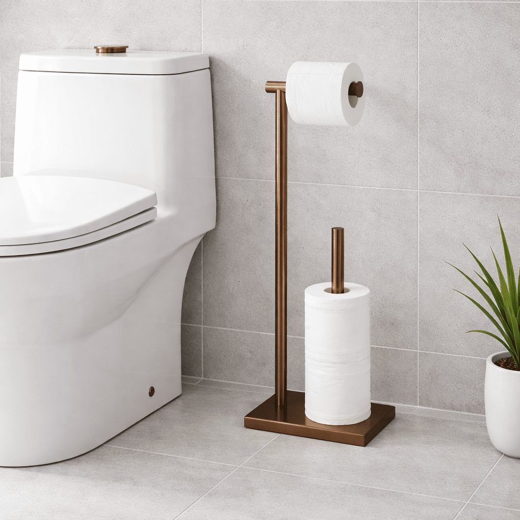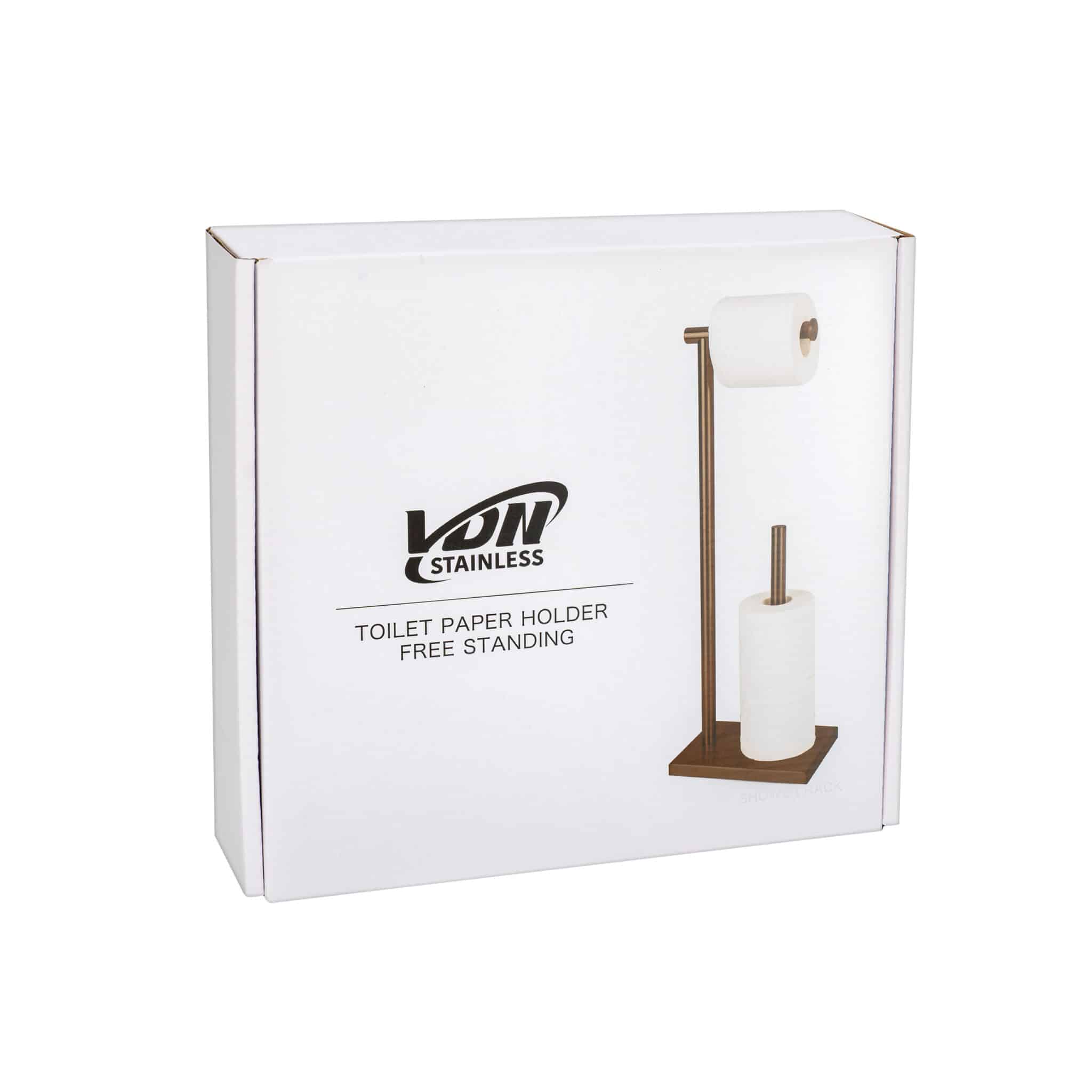 De VDN Stainless wc- en reserverolhouder in koperkleur is een stijlvolle én praktische toevoeging aan elke moderne toiletruimte. Dankzij het slimme 2-in-1 ontwerp fungeert deze houder zowel als toiletrolhouder als reserverolhouder, waardoor je altijd voldoende wc-rollen binnen handbereik hebt. De houder is gemaakt van hoogwaardig roestvrij staal (RVS) en is uitstekend bestand tegen vocht, wat hem geschikt maakt voor gebruik in het toilet of de badkamer. Met ruimte voor maximaal 4 wc-rollen biedt deze ruimtebesparende toiletrolhouder optimaal gemak zonder in te leveren op design. De warme koperen afwerking zorgt voor een luxe en eigentijdse uitstraling en maakt je toilet compleet.